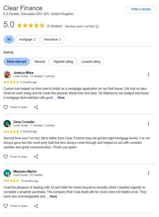 So, if you’re looking for a mortgage, insurance, or financial guidance in Doncaster and beyond, choose the company that people are consistently rating 5 stars. With Clear Finance, you’re not just a number – you’re a valued client, and your peace of mind is our priority.